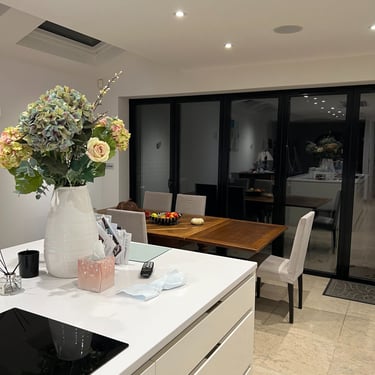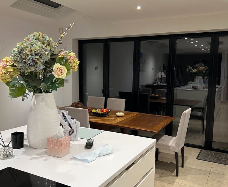 The kitchen extension had a couple of ceiling stains from an old leak (already fixed by a plumber, but the marks remained). We spot-primed those areas with a stain blocker first, then painted the whole extension ceiling fresh white. The walls got two coats of a washable durable paint - kitchens need something you can wipe down when things splatter. We also touched up the window reveals and the door frame leading to the garden.