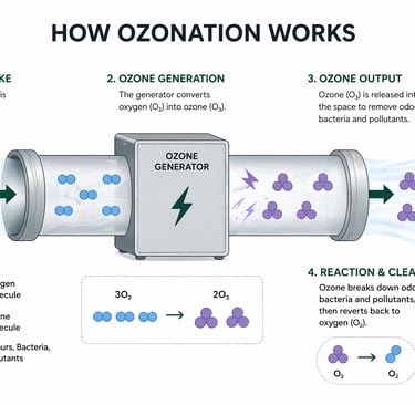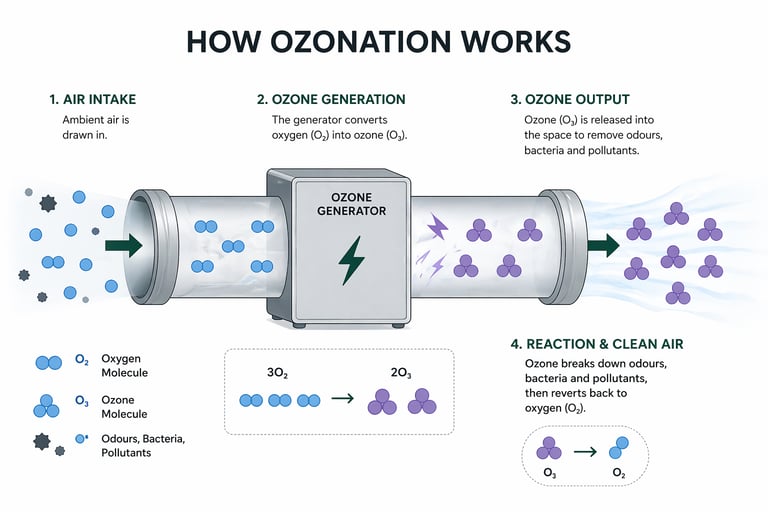 When released in a controlled environment, ozone reacts with odour molecules, bacteria, mould spores and airborne contaminants. Instead of covering smells, it helps break them down at a molecular level.