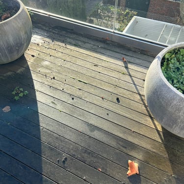 The back garden needed the most work. We cleared all old leaves and plant debris, then pressure washed every hard surface: the patio paving, the pathways, and most importantly the wooden terrace decking. The decking had developed a layer of green moss and black mould in places, making it look neglected and feel slippery and unsafe. After a careful pressure wash (using the right nozzle and pressure setting so as not to damage the wood), the moss and mould were completely gone. The natural colour of the wood came back. We let it dry fully - the owners could then decide whether to apply a protective oil or sealer after we left.
